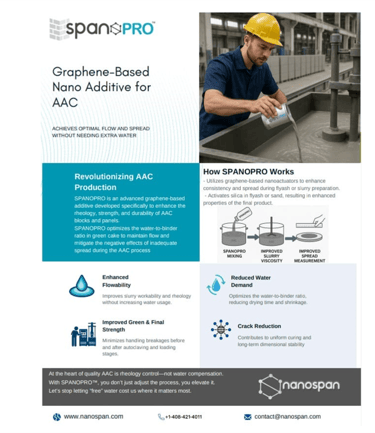 Produk unggulan Nanospan, aditif beton grafena, diakui GCCA sebagai produk kelima dari lima belas produk sejenis terbaik dunia. Saat ini, Nanospan meluncurkan produk unggulan terbarunya, SpanoPro, aditif komposit grafena partikel nano untuk aplikasi batubata beton ringan seperti; AAC. ALC & LWC. July 7th, 2023. Bagi AGIC, ini adalah kolaborasi manca negara pertama.
