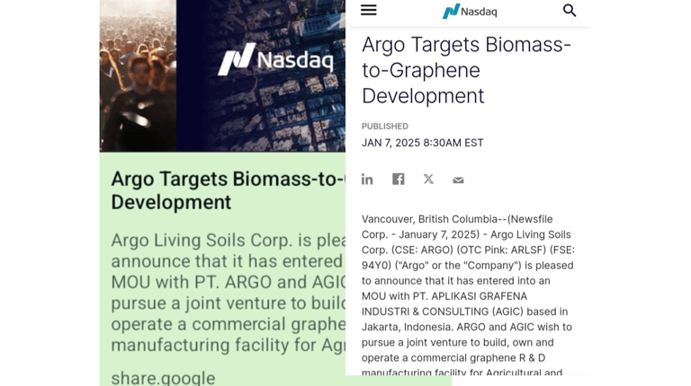 Pada 26 Desember 2024 lalu, AGIC menanda tangani Nota Kesepahaman Terbatas dengan Ago Living Soils Inc., dari Canada. Terkait kolaborasi penggalangan pendanaan untuk rencana pendirian unit produksi seri produk pupuk cair canggih G-ONC EPN NPs JVC di Indonesia. Silahkan merujuk pada; Argo Target Biomass-to-Graphene Development, Nasdaq. Silahkan klik gambar berikut untuk sambunganberita on-line terkait.